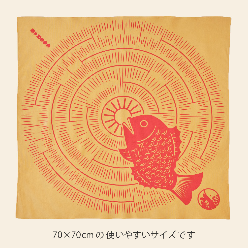 風呂敷に描いた「笠と鯛」は 伝八笠 の名残を残しつつ、