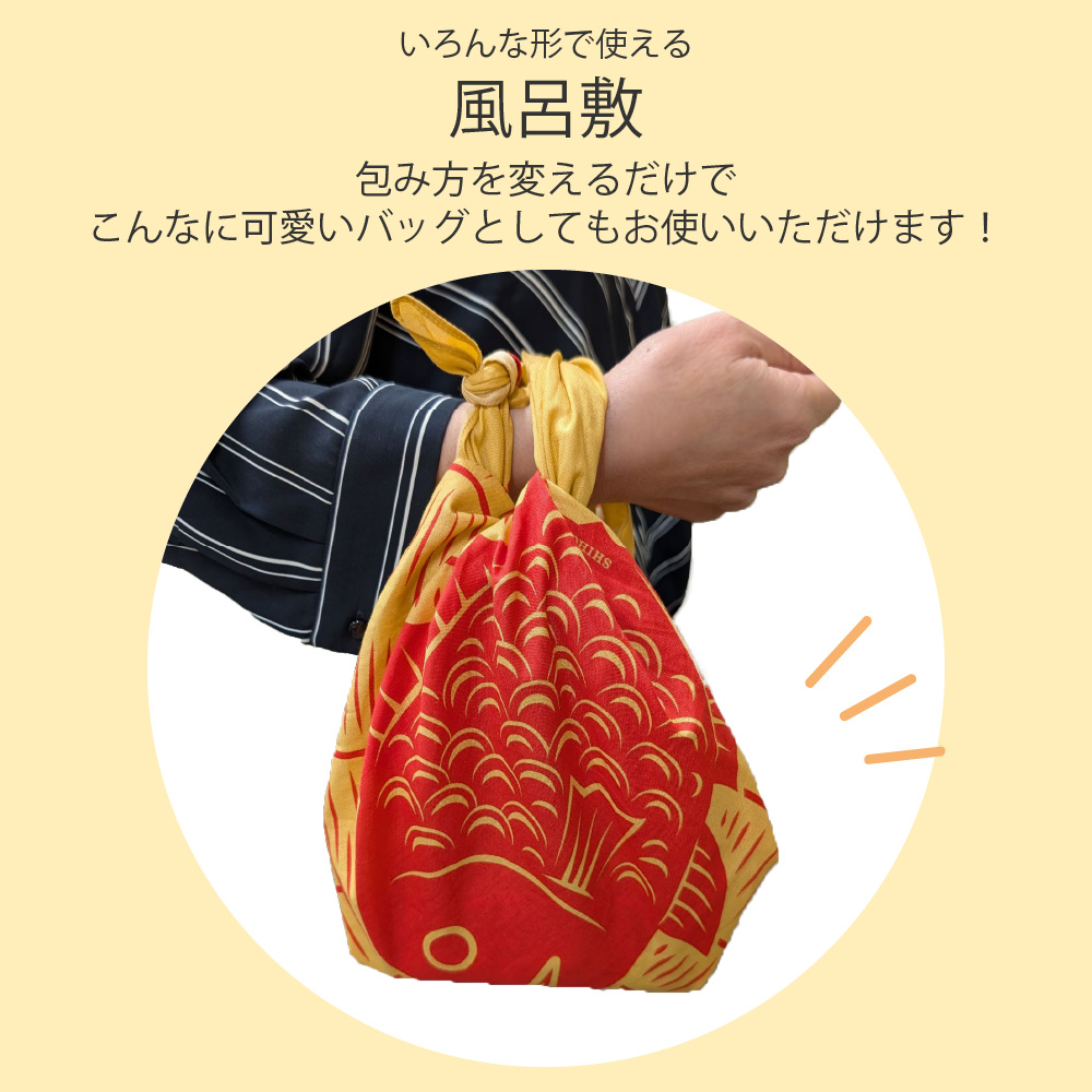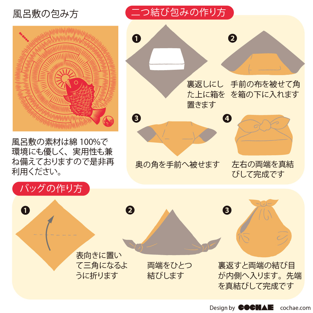 風呂敷の包み方やバッグの作り方は「お召し上がり方」に記載していますのでご利用ください。